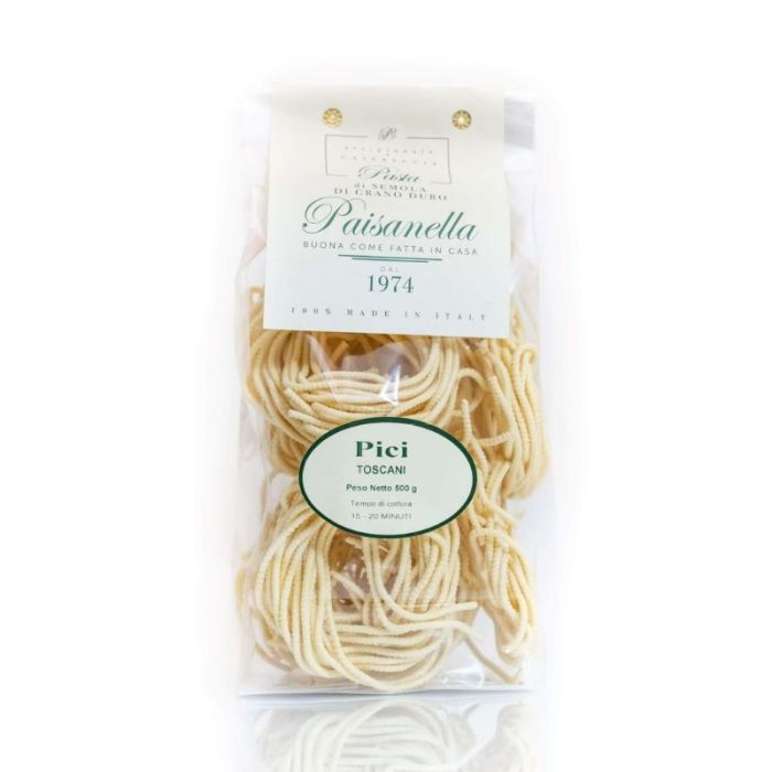 Pasta Pici von Paisanella ist eine Art handgemachte Pasta, die ihren Ursprung in der Toskana hat. Die Pici-Nudeln ähneln Spaghetti, mit dem Unterschied, dass sie rauer sind. Pici passen hervorragend zu Wildeintopf, Ente und Zucchiniblüten oder Speck.