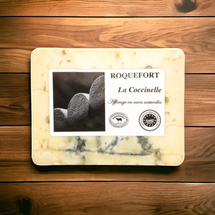 Er wird aus der Milch von Lacaune-Schafen hergestellt, einer geschätzten Rasse, die auf den grünen Weiden Frankreichs grasen. Seine Mindestreifezeit von 5 Monaten in den natürlichen Höhlen von Roquefort-sur-Soulzon verleiht dem Käse einen kräftigen und pikanten Geschmack, unverwechselbar und anhaltend. Aufgeschnitten hat der Roquefort La Coccinelle eine cremige, leicht bröckelige Textur, die von bläulichen Adern durchzogen ist, die vom Schimmelpilz Penicillium roquefort herrühren. Diese Adern sind das Markenzeichen dieses Blauschimmelkäses, der ein einzigartiges und raffiniertes sensorisches Erlebnis bietet.