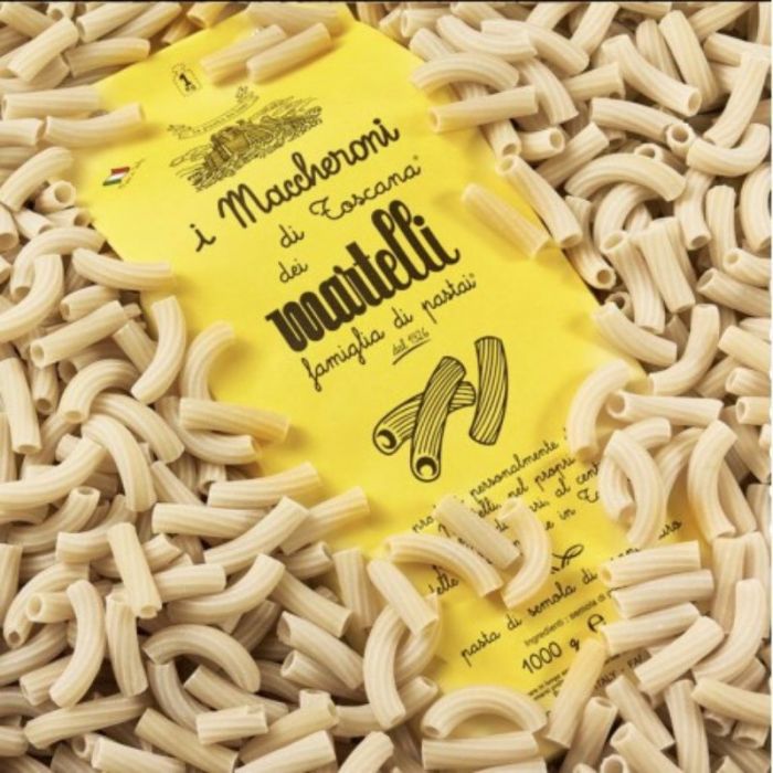 Los macarrones de la fábrica de pasta Martelli son un formato de pasta totalmente artesanal producido con granos seleccionados. El dibujo es de bronce y el secado de la pasta supera las 50 horas para garantizar una gran cantidad de proteínas que hacen que la pasta sea sabrosa. Los macarrones son excelentes acompañados de salsas y ragú de la tradición italiana.