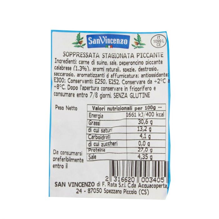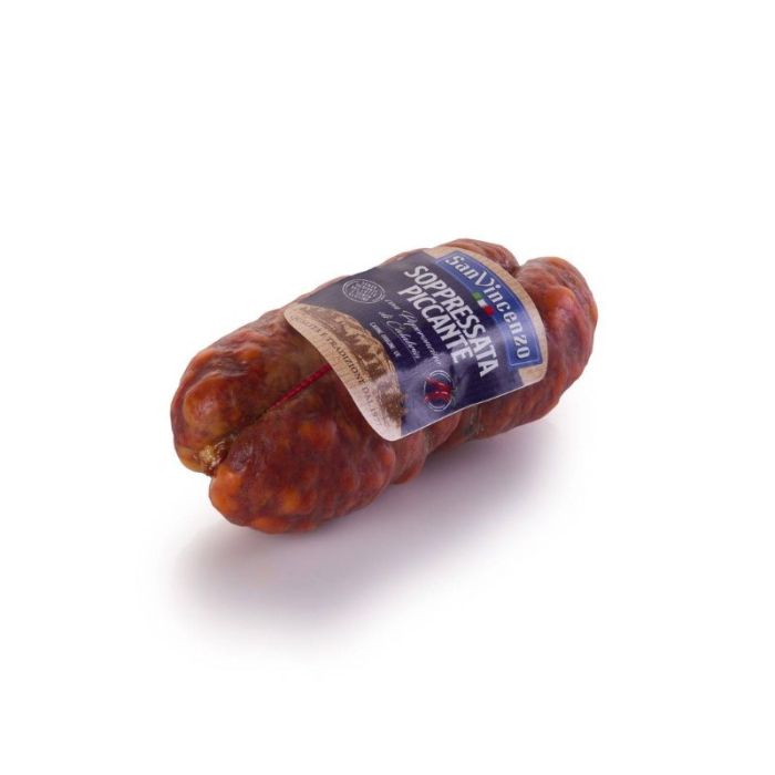La soppressata piccante San Vincenzo es una salume típica de Calabria, un producto gourmet regional elaborado con carne de cerdo seleccionada a la que se añade guindilla que hace que la soppressata sea roja, pimienta y sal. Mena elabora este salume de la mejor manera, la carne se pica groseramente, se añade pimienta en conserva y guindilla. La salchicha es de color rojo, con un sabor dulce y picante.