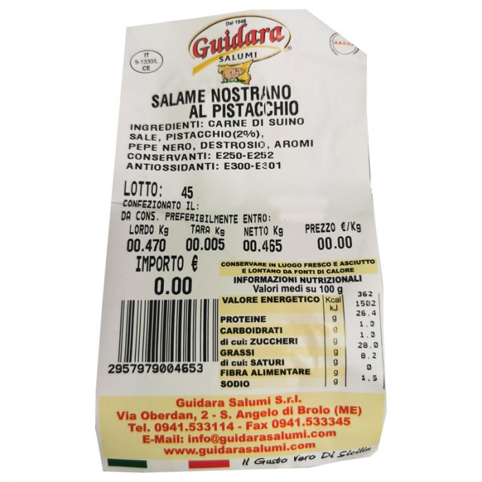 Le salami à la pistache de Guidara est un produit fabriqué uniquement à partir de matières premières de qualité supérieure, avec des recettes uniques qui ont été transmises de génération en génération. Le salami à la pistache Nostrano Guidara a un goût extraordinaire et est apprécié par de nombreuses personnes dans le monde entier. Le salami Guidara est produit à partir des meilleures matières premières. Il a un goût extraordinaire, un véritable must pour tous les amateurs de salami.