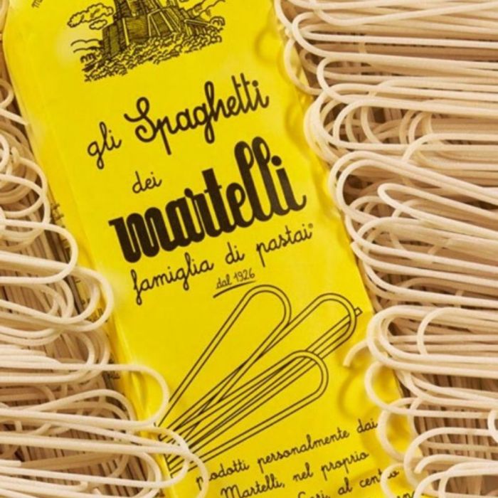 Spaghetti Martelli est un produit fait à la main à 100% de la Toscane en Italie, précisément à Lari près de Pise fantastique, tout processus de production est fabriqué à la main la pâte jusqu'à la fabrication d'emballage. Spaghetti Martelli sont produites avec du blé sélectionné teneur élevée en protéines italienne. Spaghetti ils sont dessinés en bronze ont une texture rugueuse pour mieux absorber les sauces et condiments. Un autre élément de qualité pour ces pâtes est le séchage naturel qui se produit à 32-36 ° C pendant 50 heures, ce processus préserve les protéines provenant de la combustion de façon Martelli Spaghetti sera plus savoureux et facile à cuisiner.