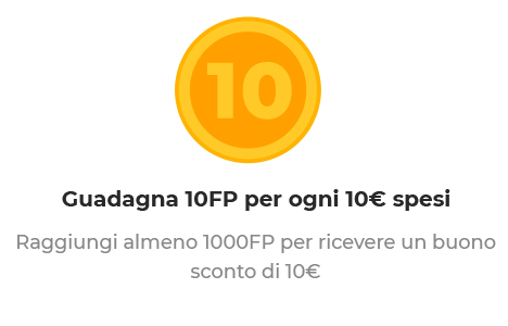 Ogni 1000 punti avrai diritto a 10€ sul tuo prossimo ordine. Puoi decidere di non utilizzare subito i punti ed accumulare fino ad un massimo di 5000.
